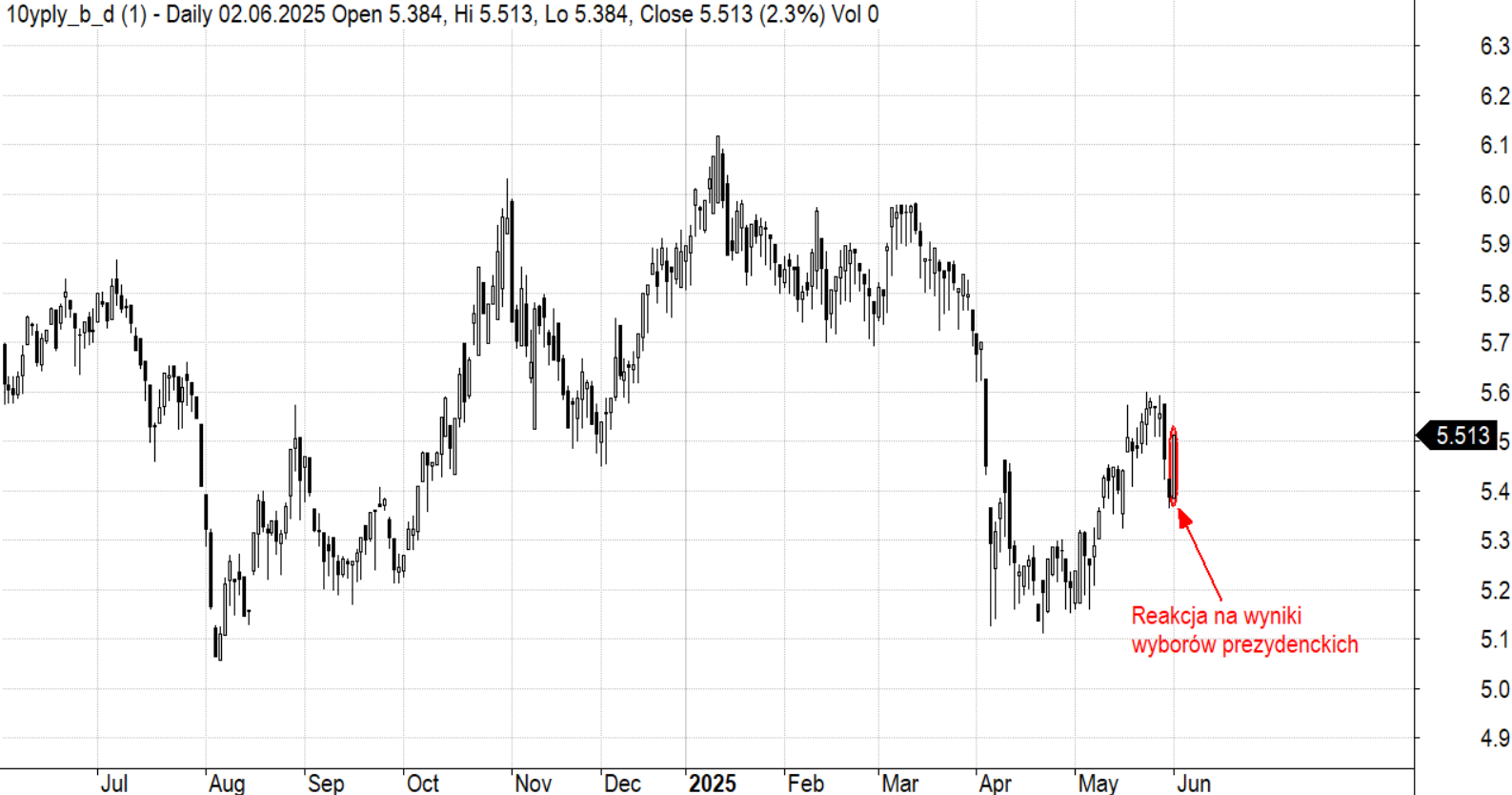 Rentowności polskich dziesięcioletnich obligacji w ciągu ostatnich 12 miesięcy