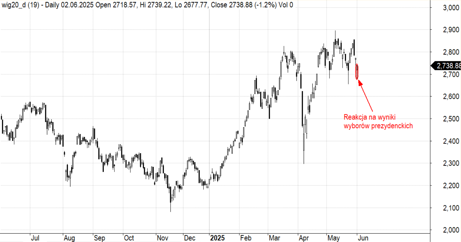 Wbrew prognozom, nowym prezydentem Polski zostanie Karol Nawrocki. Na rynku nie widać jednak paniki. Przed południem WIG20 spada o 1,2%, a indeks szerokiego rynku - o 0,8%. Najmocniej tracą walory banków, a w szczególności Banku Pekao. Przecena sięgająca 3,4% nie jest jednak wywołana wynikiem wyborów, a ogłoszonym w poniedziałek planem przekształcenia PZU w holding.