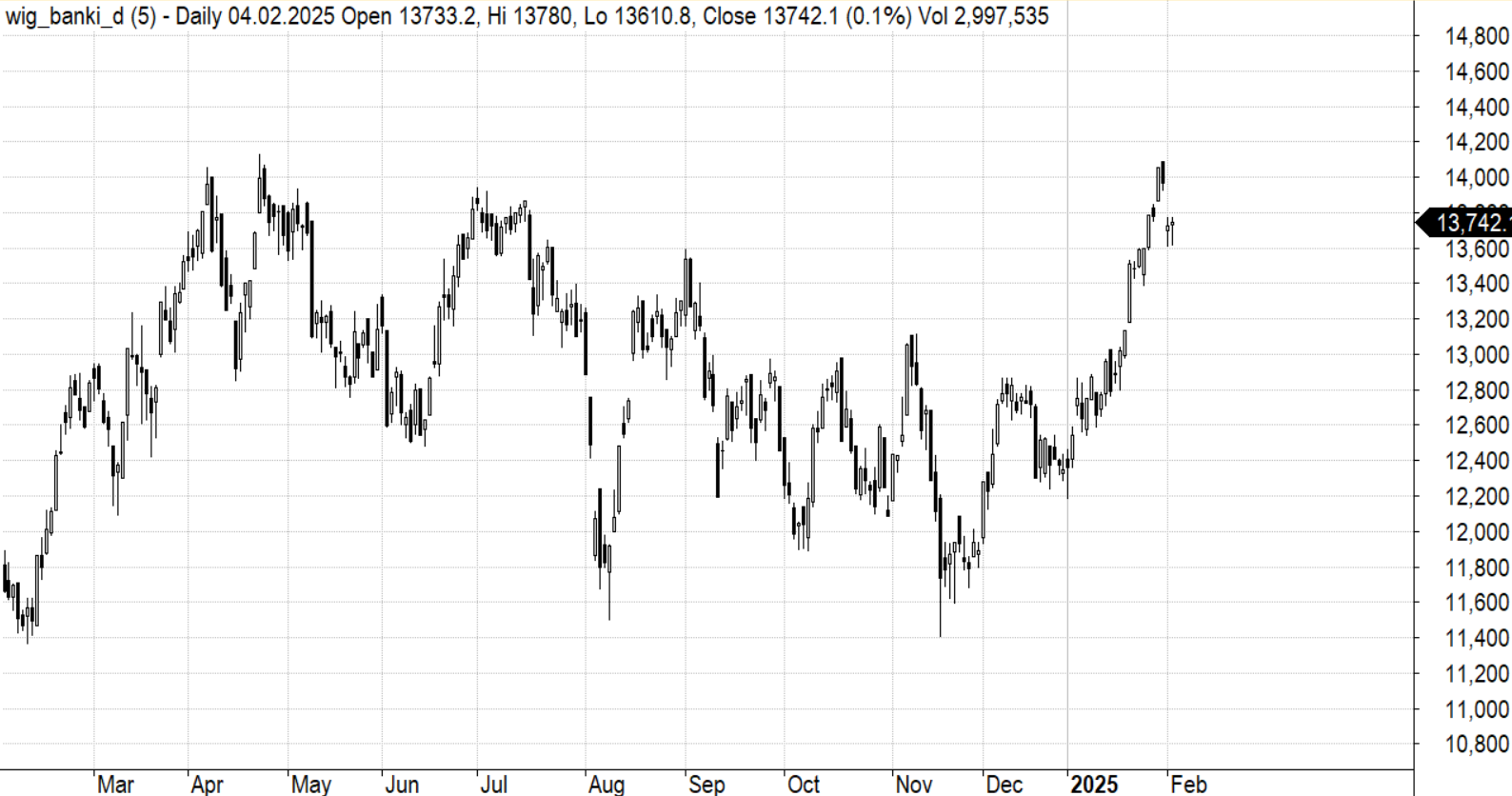W styczniu indeks WIG-banki zyskał ponad 13%, do czego przyczyniło się m.in. wymienione wyżej umocnienie złotego oraz ich stosunkowo niska wycena.