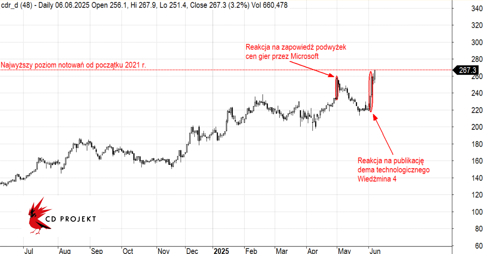 „Niedawno zobaczyliśmy technologiczne demo Wiedźmina 4. Pozwala to sądzić, że choć premiera nastąpi po 2026 r., to spółka może mieć sporo asów w rękawie i budować zainteresowanie tytułem. Oprócz tego ogłoszono, że CD Projekt pracuje także nad trzema nieogłoszonymi projektami, w tym dwoma growymi, na które wydatki są już kapitalizowane. Pokazuje to, że do 2027 r. spółka może nas jeszcze zaskoczyć następnymi informacjami” dodaje Mickiewicz.