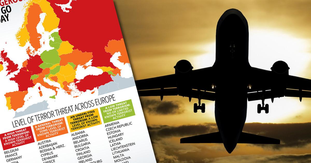 Rys. 1. Poziom zagrożenia terroryzmem w Europie wg brytyjskiego MSZ, czyli gdzie jechać na wakacje (kolor czerwony: największy stopień zagrożenia, kolor zielony: najmniejszy stopień zagrożenia).