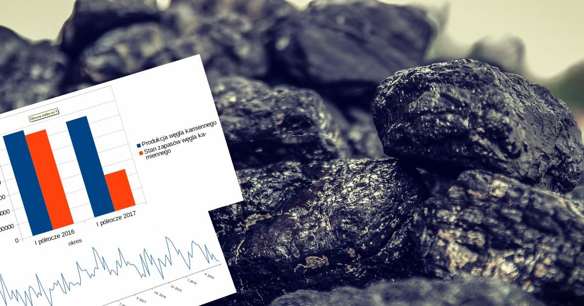 Porównując I półrocze 2017 roku do I półrocza 2016 roku również widać tendencję spadkową zarówno w przypadku wydobycia węgla kamiennego jak i jego zapasów.