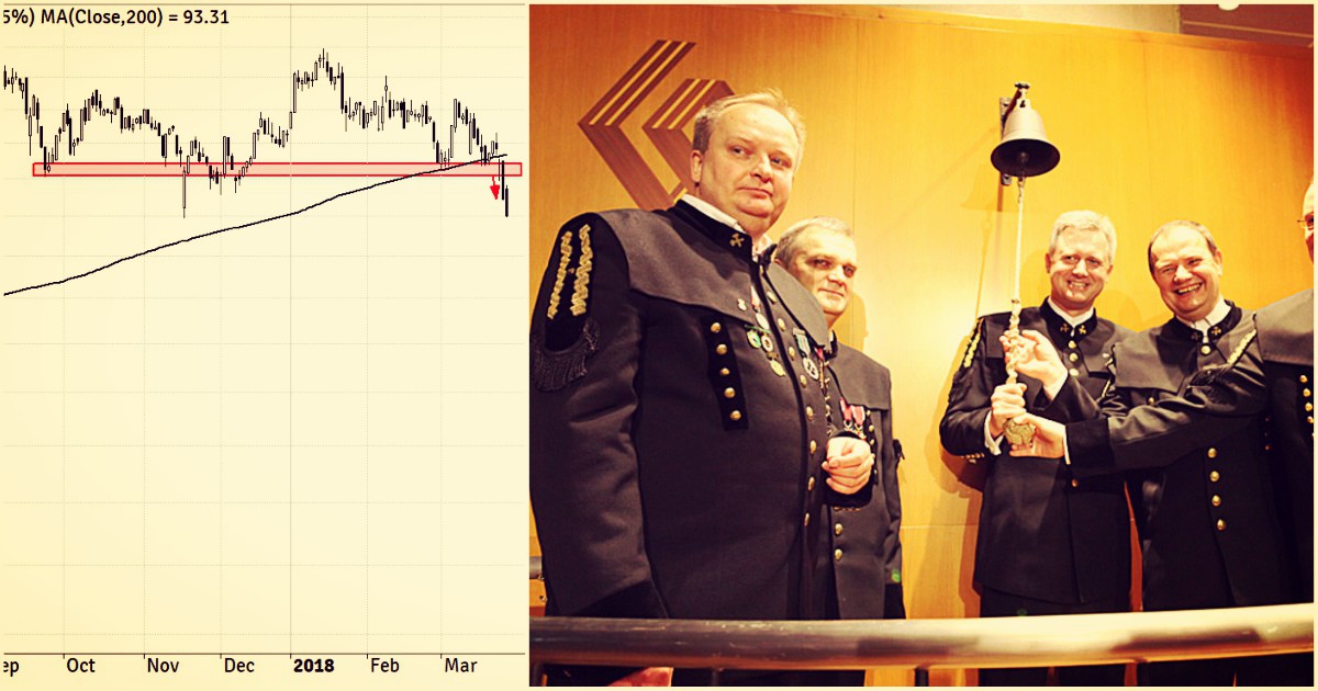 Wystarczy spojrzeć na wykres akcji JSW, żeby dostrzec wygenerowane sygnały prospadkowe. Dwie ostatnie czarne świece przełamały bardzo ważne wsparcie na poziomie 90 zł. Dołem został wybity dwumiesięczny kanał spadkowy. Podczas wtorkowej sesji (27.03.2018) popyt próbował w trakcie sesji powrócić ponad przebity opór, ale w jego pobliżu uaktywniła się agresywna podaż spychająca kurs na nowe lokalne minima i kurs zamknięcia sesji na poziomie 85 zł.