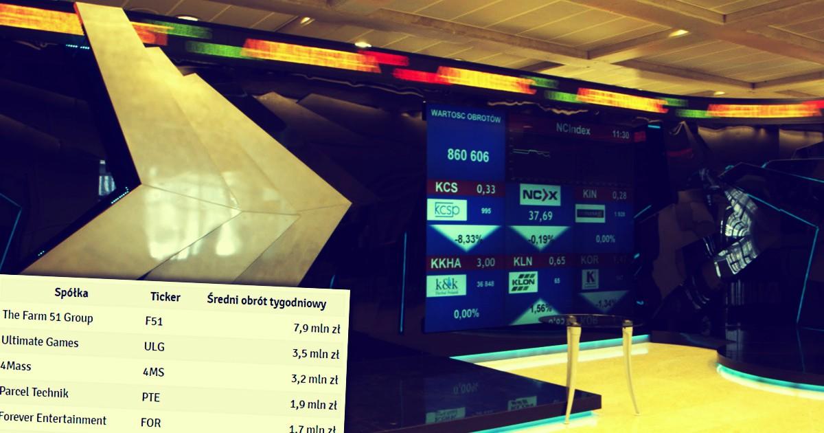 Wśród najbardziej płynnych walorów królują spółki produkujące gry. Na pierwszym miejscu jest The Farm 51 - deweloper, który w październiku wypuścił swoją flagową grę „World War III” w wersji early access. Wciąż utrzymuje się zainteresowanie spółką wśród inwestorów indywidualnych, mimo że wartość akcji od premiery gry sporo się zmniejszyła.