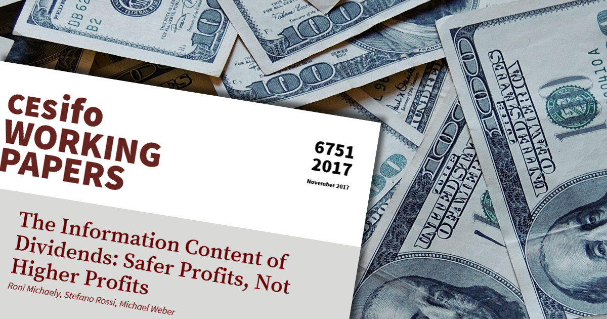 Ostatnio Roni Michaely z Cornell University, Stefano Rossi z Bocconi University oraz Michael Weber z Booth School of Business (University of Chicago) ponownie podeszli do tematu sygnałów wysyłanych przez dywidendy i zmiany w polityce dywidendowej. Swoje odkrycia opublikowali w artykule pt. “The Information Content of Dividends: Safer Profits, Not Higher Profits” na łamach zeszytów naukowych Center for Economic Studies Uniwersytetu Ludwiga i Maksymiliana w Monachium oraz ifo Institute.