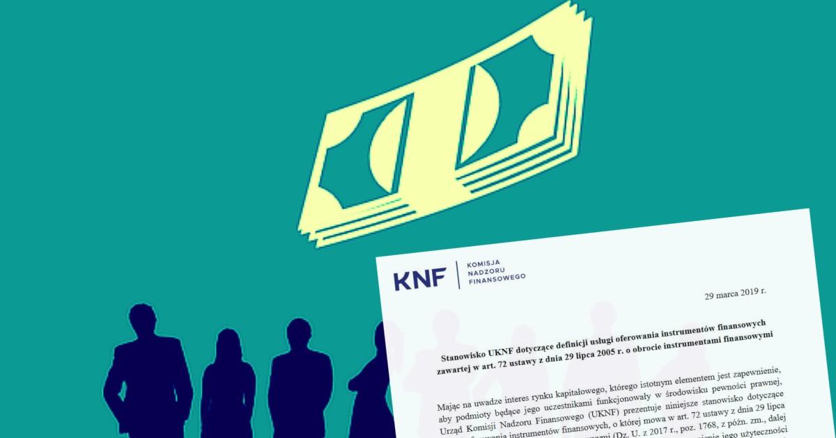 29 marca Komisja Nadzoru Finansowego (KNF) opublikowała „Stanowisko UKNF dotyczące definicji usługi oferowania instrumentów finansowych zawartej w art. 72 ustawy z dnia 29 lipca 2005 r. o obrocie instrumentami finansowymi”, a dokładnie dotyczące obejmowania akcji i obligacji w ramach tzw. crowdfundingu udziałowego. Od tamtej pory nie cichną komentarze i są one bardzo zróżnicowane. Swoim stanowiskiem KNF wprowadziła na polskim rynku crowdfundingu wiele zamieszania.