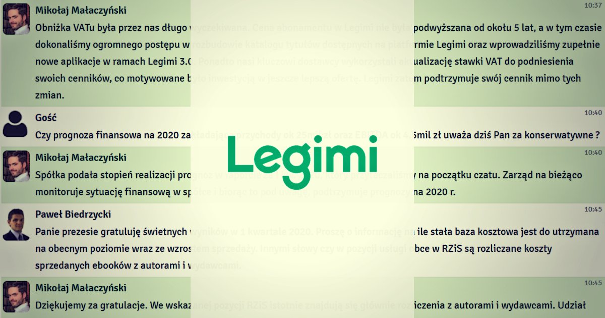 W piątek, 3 lipca 2020 r. odbył się czat inwestorski z prezesem zarządu Legimi, Mikołajem Małaczyńskim. Podczas spotkania rozmawialiśmy o szczegółach emisji obligacji. Inwestorzy zadawali również pytania o debiut na NewConnect, liczbę klientów oraz rozwój na rynku niemieckim. W spotkaniu wzięło udział blisko 450 osób, a prezes zarządu odpowiedział na ponad 20 pytań. Zapraszamy do lektury całej relacji z czatu.
