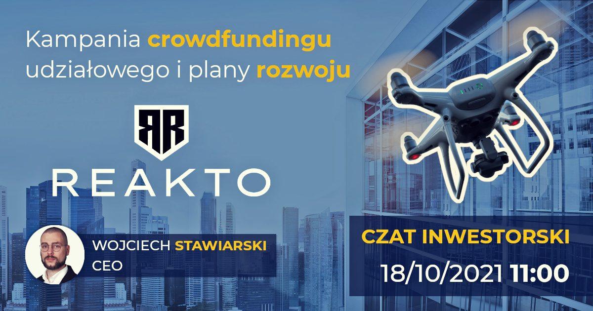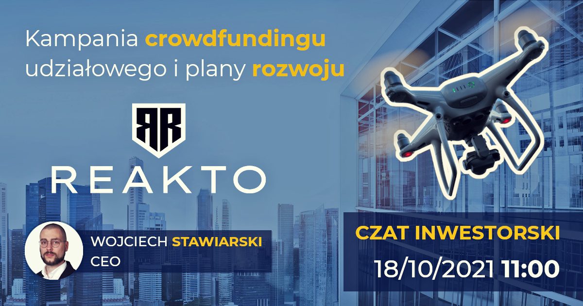 O szczegółach trwającej kampanii crowdfundingowej na platformie SmartFunds oraz planach rozwoju na rynku dronów będzie można porozmawiać z prezesem REAKTO, Wojciechem Stawiarskim. Spotkanie odbędzie się poniedziałek, 18 października 2021 r. o godz. 11:00.