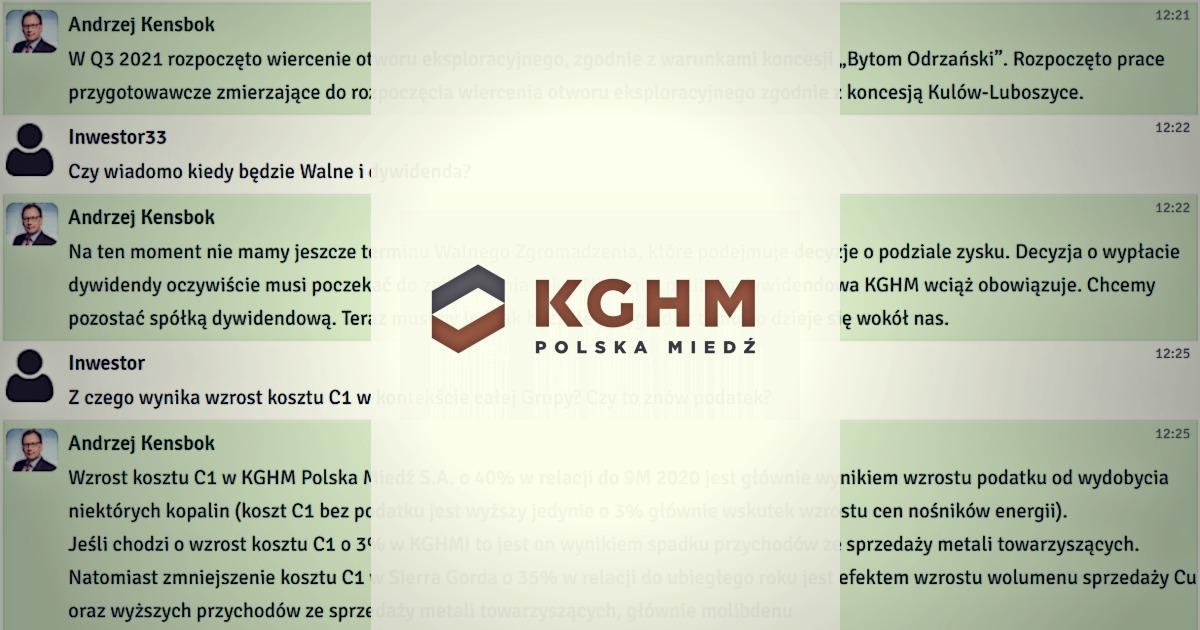 W czwartek, 18 listopada 2021 r. odbył się czat inwestorski z Wiceprezesem Zarządu ds. Finansowych KGHM Polska Miedź S.A., Andrzejem Kensbokiem. Podczas spotkania rozmawialiśmy o wynikach finansowych za III kwartał 2021 roku. Inwestorzy zadawali również pytania o sytuację na rynku surowców oraz produkcję miedzi płatnej.