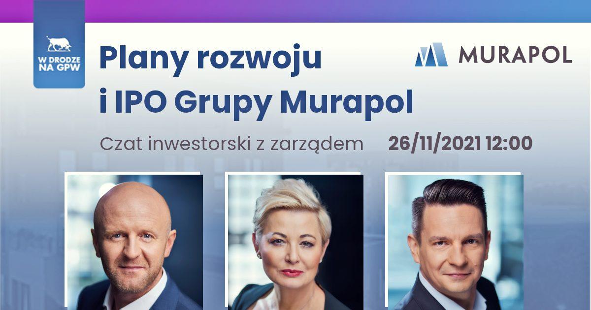 O szczegółach oferty publicznej akcji oraz debiucie na Głównym Rynku GPW będzie można porozmawiać z zarządem Grupy Murapol. Czat inwestorski odbędzie się w piątek, 26 listopada 2021 r. o godz. 12:00. W spotkaniu wezmą udział: