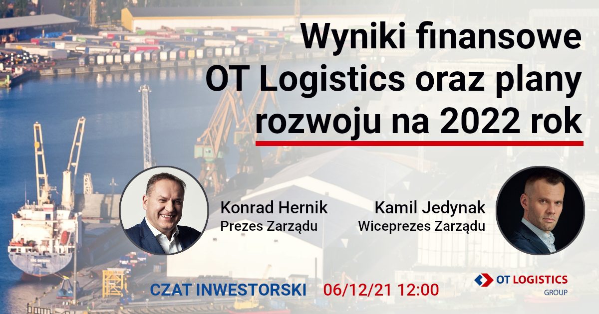 O wynikach finansowych za trzy kwartały 2021 roku, efektach restrukturyzacji spółki oraz planach rozwoju na 2022 rok będzie można porozmawiać z zarządem OT Logisgtics. Czat inwestorski odbędzie się w poniedziałek, 6 grudnia 2021 r. o godz. 12:00. W spotkaniu wezmą udział: