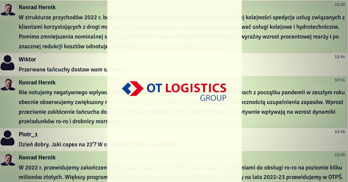W poniedziałek, 6 grudnia 2021 r. odbył się czat inwestorski z zarządem Grupy OT Logistic. W spotkaniu wzięli udział prezes Konrad Hernik oraz wiceprezes Kamil Jedynak. Podczas spotkania rozmawialiśmy o wynikach finansowych spółki. Inwestorzy zadawali również pytania o program inwestycji, politykę dywidendową oraz działalność portową.