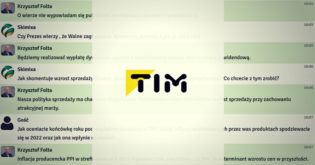 W czwartek, 9 grudnia 2021 r. odbył się czat inwestorski z zarządem Grupy TIM - Krzysztofem Foltą, prezesem zarządu oraz Piotrem Nosalem, członkiem zarządu i dyrektorem handlowym, a także Piotrem Tokarczukiem, członkiem zarządu i dyrektorem finansowym. Podczas spotkania rozmawialiśmy o wynikach finansowych za III kwartał 2021 roku. Inwestorzy zadawali również pytania o nową strategię, politykę dywidendową oraz upublicznienie spółki 3LP.