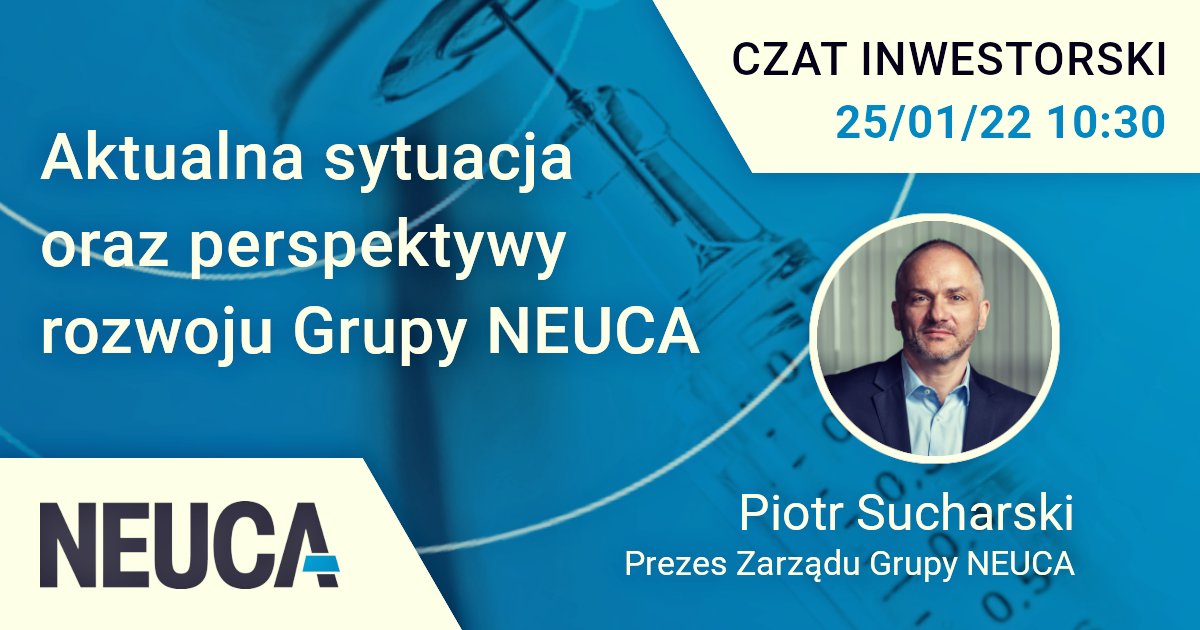 O bieżącej sytuacji oraz planach rozwoju Grupy NEUCA będzie można porozmawiać z prezesem zarządu spółki, Piotrem Sucharskim. Spotkanie odbędzie się we wtorek, 25 stycznia 2022 roku o godz. 10:30.