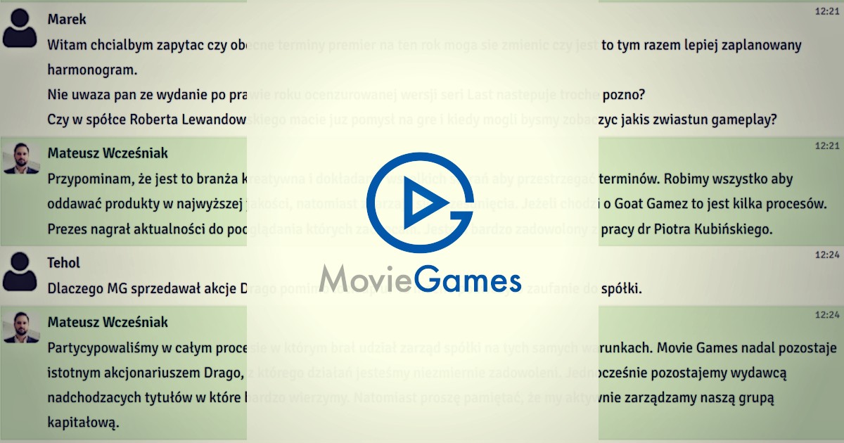 W piątek, 21 stycznia 2022 r. odbył się czat inwestorski z prezesem zarządu Grupy Movie Games, Mateuszem Wcześniakiem oraz doradcą ds. M&A, Kamilem Gemrą. Podczas spotkania rozmawialiśmy o planach rozwoju na rynku gier. Inwestorzy zadawali również pytania o wypłatę dywidendy, przeniesienie notowań na Główny Rynek GPW oraz plan premier.
