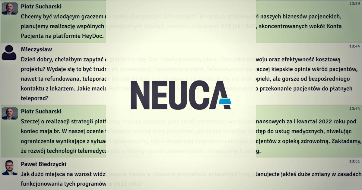 We wtorek 25 stycznia 2022 r. odbył się czat inwestorski z prezesem zarządu Grupy Neuca, Piotrem Sucharskim. Podczas spotkania rozmawialiśmy o perspektywach rozwoju w 2022 roku. Inwestorzy zadawali również pytania o kolejne inwestycje oraz politykę dywidendową.