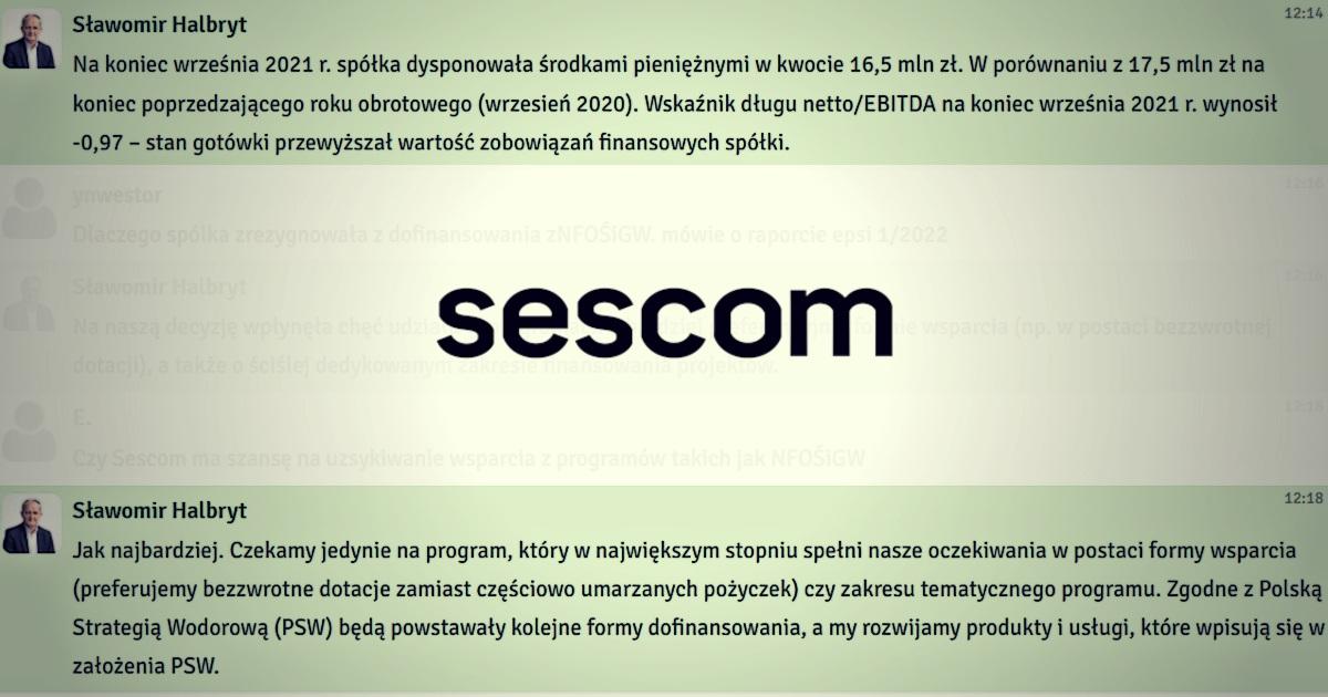 W środę 2 lutego 2022 r. odbył się czat inwestorski z prezesem zarządu Sescom, Sławomirem Halbrytem. Podczas spotkania rozmawialiśmy o wynikach finansowych za rok obrotowy 2020/2021. Inwestorzy zadawali również pytania o planowane akwizycje, politykę dywidendową oraz wpływ pandemii na działalność spółki.