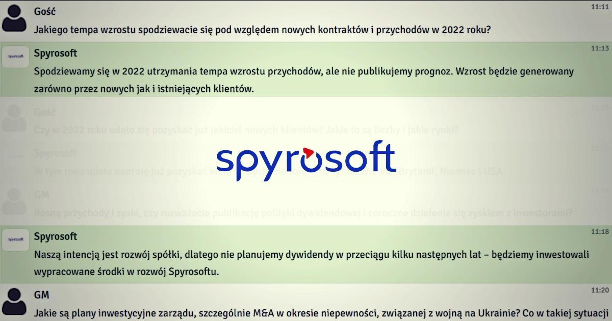W poniedziałek 14 marca 2022 r. odbył się czat inwestorski z zarządem spółki Spyrosoft - prezesem zarządu, Konradem Weiske oraz członkiem zarządu i dyrektorem finansowym, Wojciechem Bodnarusiem. Podczas spotkania rozmawialiśmy o przeniesieniu notowań na Główny Rynek GPW. Inwestorzy zadawali również pytania o planowane akwizycje, aktualną sytuację finansową oraz rozwój na rynkach zagranicznych.