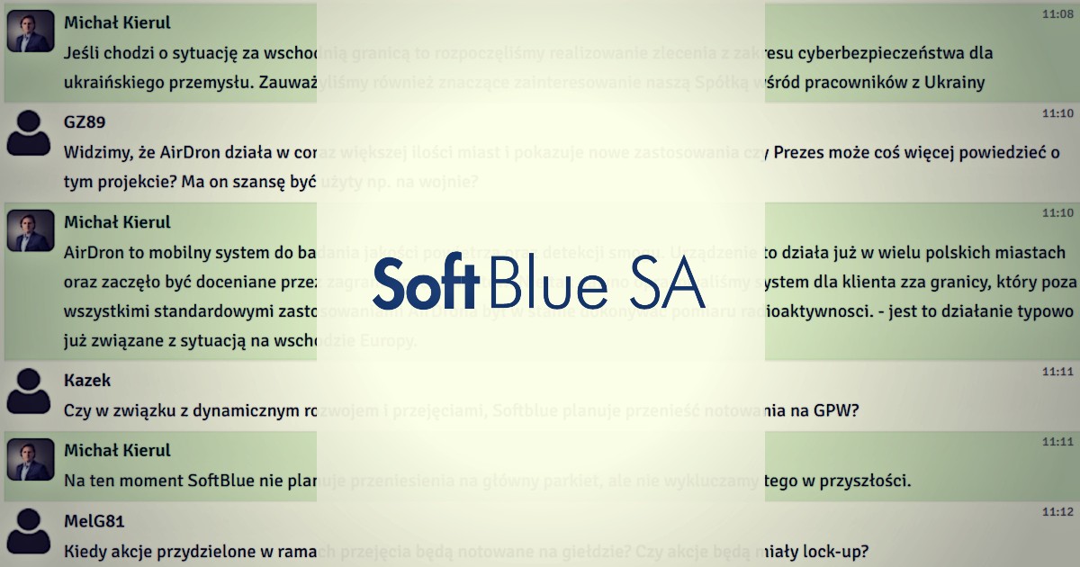 W środę 23 marca 2022 r. odbył się czat inwestorski z prezesem zarządu SoftBlue, Michałem Kierulem. Podczas spotkania rozmawialiśmy o aktualnej sytuacji spółki. Inwestorzy zadawali również pytania o działalność na rynku akwizycji, budowę Centrum B+R oraz plany rozwoju.