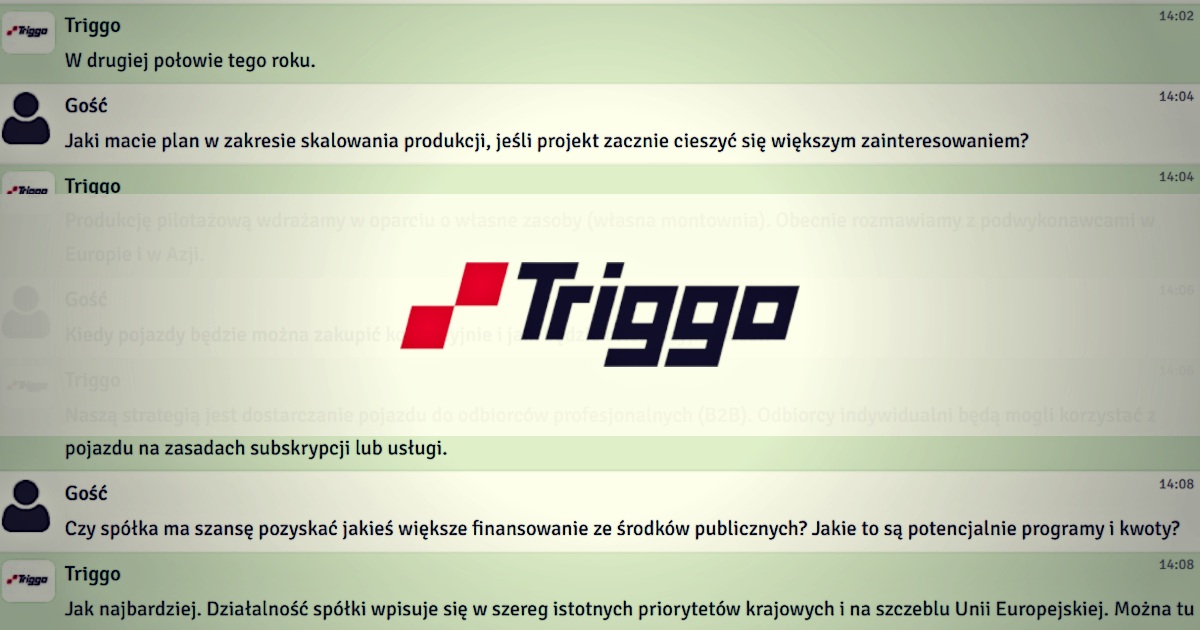 „Celem realizowanych pilotaży jest doprowadzenie do zamówień co najmniej kilkudziesięciu sztuk pojazdów z dostawą na rok 2023” - relacja czatu z zarządem Triggo