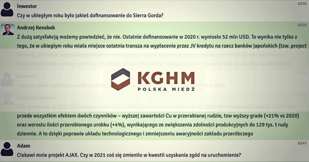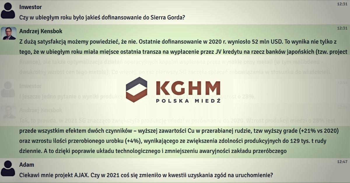 W piątek, 25 marca 2022 r. odbył się czat inwestorski z Wiceprezesem Zarządu ds. Finansowych KGHM Polska Miedź S.A., Andrzejem Kensbokiem. Podczas spotkania rozmawialiśmy o wynikach finansowych za 2021 rok. Inwestorzy zadawali również pytania o sytuację na rynku surowców oraz produkcję miedzi płatnej.