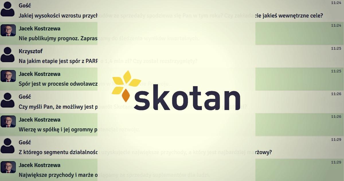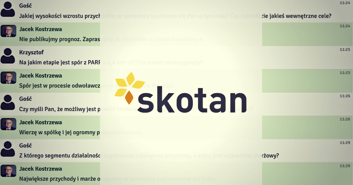 We wtorek, 12 kwietnia 2022 r. odbył się czat inwestorski z prezesem zarządu Skotan, Jackiem Kostrzewą. Podczas spotkania rozmawialiśmy o trwającej ofercie publicznej akcji. Inwestorzy zadawali również pytania o nową linię suplementów, sytuację finansową spółki oraz dalsze plany rozwoju.