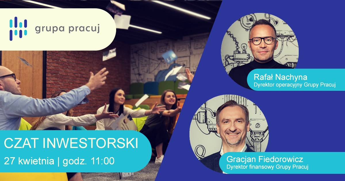 O wynikach finansowych Grupy Pracuj, sytuacji na rynku pracy oraz planach rozwoju będzie można porozmawiać z Rafałem Nachyną, dyrektorem operacyjnym Grupy Pracuj oraz Gracjanem Fiedorowiczem, dyrektorem finansowym. Spotkanie odbędzie się w środę, 27 kwietnia 2022 r. o godz. 11:00. Zapraszamy do zadawania pytań już teraz.