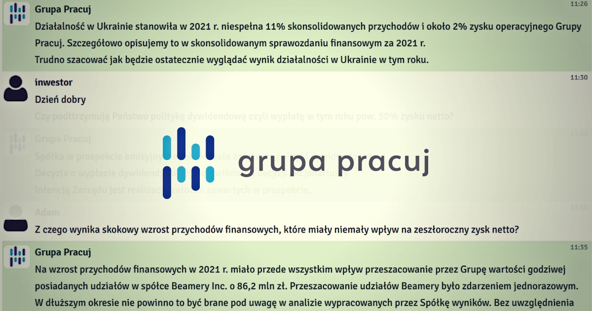 W środę, 27 kwietnia 2022 r. odbył się czat inwestorski z Zarządem Grupy Pracuj: Rafałem Nachyną, dyrektorem operacyjnym oraz Gracjanem Fiedorowiczem, dyrektorem finansowym. Podczas spotkania rozmawialiśmy o wynikach finansowych za 2021 rok. Inwestorzy zadawali również pytania o politykę dywidendową, sytuację na rynku pracy oraz dalsze plany rozwoju.