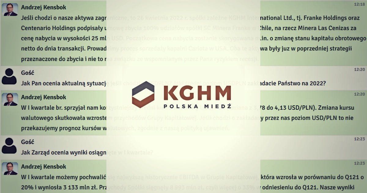 W poniedziałek, 16 maja 2022 r. odbył się czat inwestorski z Wiceprezesem Zarządu ds. Finansowych KGHM Polska Miedź S.A., Andrzejem Kensbokiem. Podczas spotkania rozmawialiśmy o wynikach finansowych za I kwartał 2022 roku. Inwestorzy zadawali również pytania o sytuację na rynku surowców oraz wpływ wojny w Ukrainie na działalność Spółki.