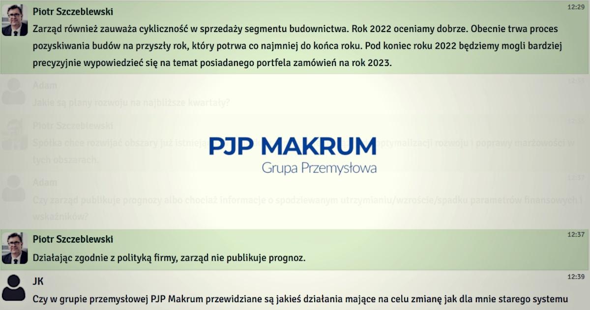 „Spółka posiada moce produkcyjne pozwalające pozyskać kolejne projekty z realizacją na ten rok” - relacja czatu z prezesem zarządu PJP Makrum