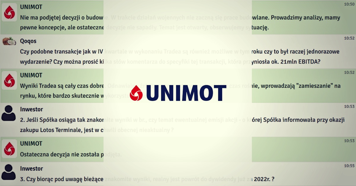 „Zgodnie z naszą polityką dywidendową robimy wszystko, abyśmy mogli wrócić do wypłat dywidendy już za 2022 r.” - relacja czatu z zarządem Grupy UNIMOT