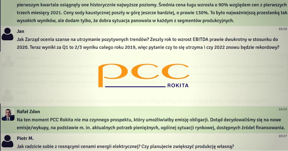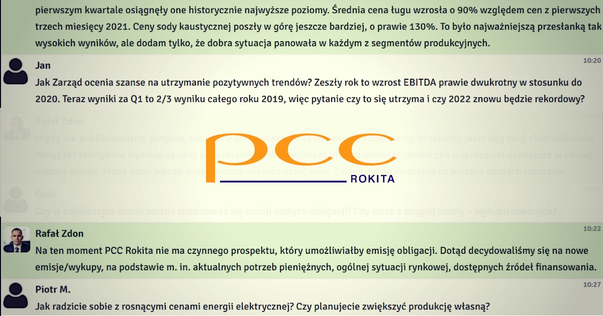W czwartek 26 maja 2022 r. odbył się czat inwestorski z wiceprezesem zarządu PCC Exol, Rafałem Zdonem. Podczas spotkania rozmawialiśmy o wynikach finansowych spółki za I kwartał 2022 roku. Inwestorzy zadawali również pytania o sytuację na rynku surowców, realizowane inwestycje oraz wypłatę dywidendy.