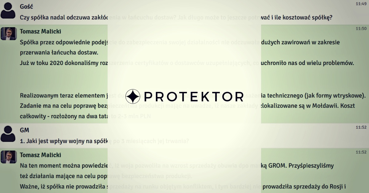 We wtorek 31 maja 2022 r. odbył się czat inwestorski z prezesem zarządu Protektor, Tomaszem Malickim. Podczas spotkania rozmawialiśmy o wynikach finansowych spółki za I kwartał 2022 roku. Inwestorzy zadawali również pytania o udział w przetargach, ofertę produktów oraz wypłatę dywidendy.