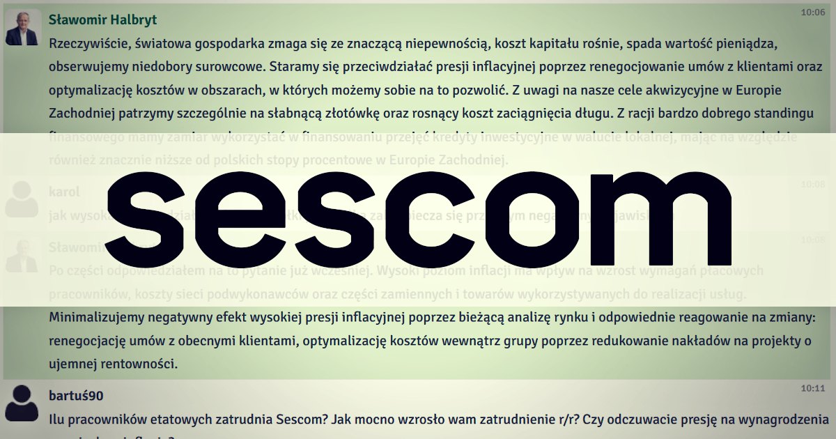 W poniedziałek 27 czerwca 2022 r. odbył się czat inwestorski z prezesem zarządu Sescom, Sławomirem Halbrytem. Podczas spotkania rozmawialiśmy o wynikach finansowych za I półrocze 2021/2022 roku. Inwestorzy zadawali również pytania o perspektywy rynku Facility Management, postępy w reealizacji strategii spółki, wpływ inflacji na sytuację spółki, czy rozwój segmentów technologicznych spółki.