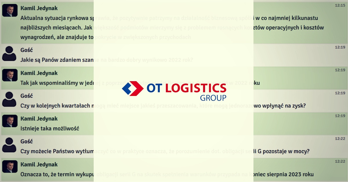 We wtorek 23 sierpnia 2022 r. odbył się czat inwestorski z Kamilem Jedynakiem, prezesem OT Logistics oraz Danielem Góreckim, członkiem zarządu. Podczas spotkania rozmawialiśmy o wynikach finansowych spółki. Inwestorzy zadawali również pytania o wypłatę dywidendy, sytuację rynkową oraz realizowane inwestycje.