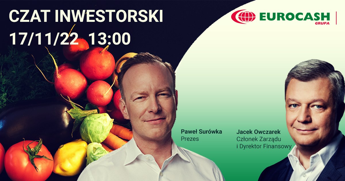 W czwartek, 17 listopada 2022 r. o godz. 13:00 zapraszamy na czat z prezesem zarządu Grupy Eurocash Pawłem Surówką oraz członkiem zarządu i dyrektorem finansowym Jackiem Owczarkiem. Podczas spotkania zostaną omówione wyniki finansowe za III kwartał br. i strategia rozwoju na lata 2023-2025. Już teraz zapraszamy do zadawania pytań.