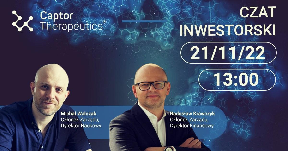 W poniedziałek, 21 listopada 2022 r. o godz. 13:00 zapraszamy na czat z członkami zarządu Captor Therapeutics Michałem Walczakiem, dyrektorem naukowym oraz Radosławem Krawczykiem, dyrektorem finansowym. Podczas spotkania zostaną omówione obecnie prowadzone badania, nowe partnerstwo z Ono Pharmaceutical oraz dalsze możliwości wykorzystania platformy OptigradeTM.