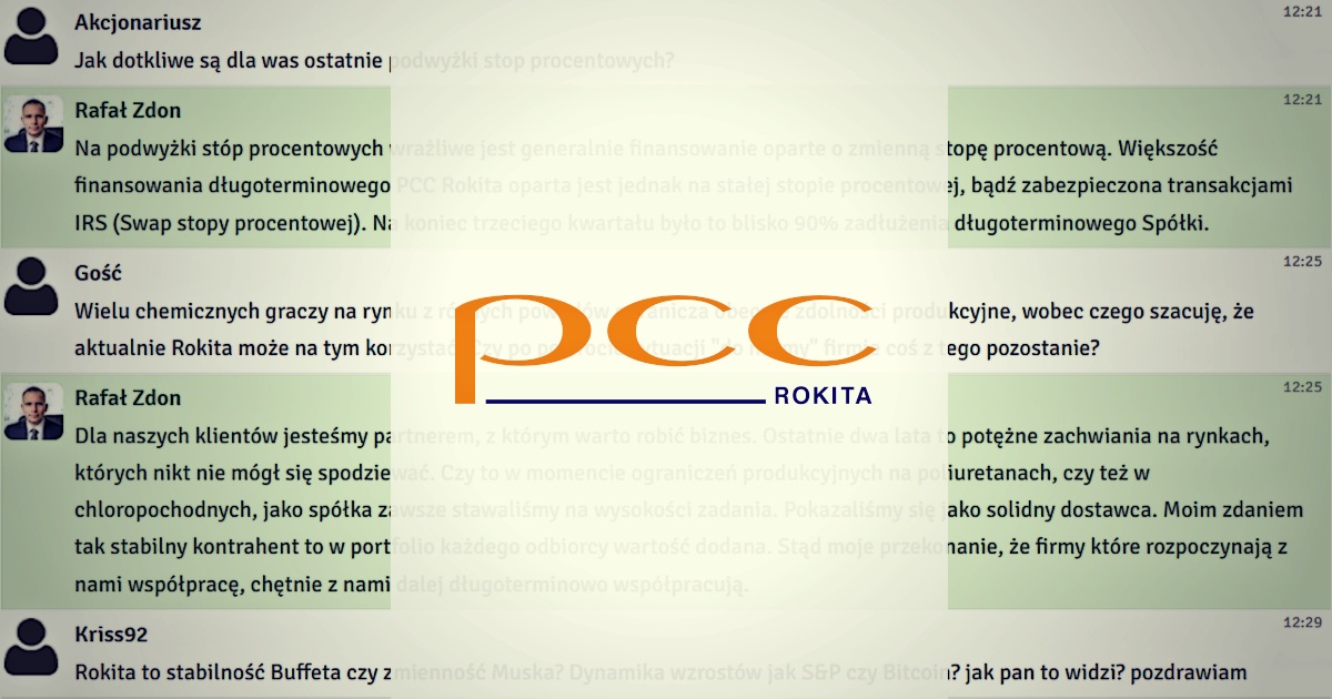 We wtorek 22 listopada 2022 r. odbył się czat inwestorski z wiceprezesem zarządu PCC Rokita, Rafałem Zdonem. Podczas spotkania rozmawialiśmy o wynikach finansowych spółki za III kwartał 2022 roku. Inwestorzy zadawali również pytania o aktualne inwestycje i rozwój portfolio produktowego.