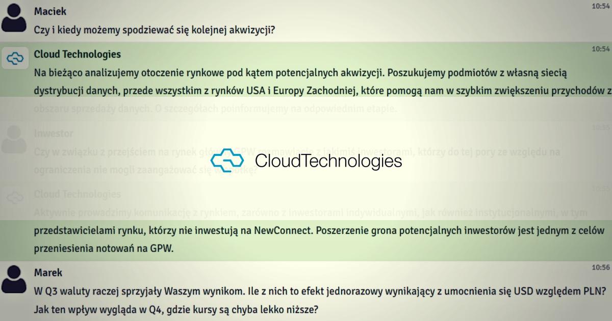 We wtorek, 22 listopada 2022 r. odbył się czat inwestorski z prezesem zarządu Cloud Technologies, Piotrem Prajsnarem oraz CFO i członkiem zarządu, Piotrem Soleńcem. Podczas spotkania rozmawialiśmy o wynikach finansowych za III kwartał br. Inwestorzy zadawali również pytania o dynamikę sprzedaży danych, przeniesienie notowań na Główny Rynek GPW oraz dalsze plany działalności w kontekście obecnie obowiązującej strategii.