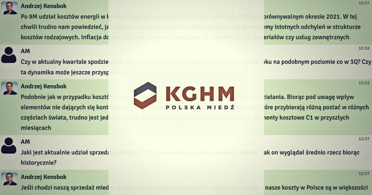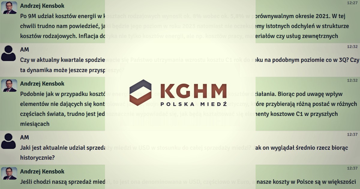 W poniedziałek, 28 listopada 2022 r. odbył się czat inwestorski z wiceprezesem zarządu KGHM ds. finansowych, Andrzejem Kensbokiem. Podczas spotkania rozmawialiśmy o wynikach finansowych za III kwartał 2022 roku. Inwestorzy zadawali również pytania o sytuację na rynku surowców oraz technologię SMR.