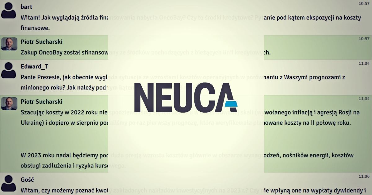 We wtorek, 7 lutego 2023 r. odbył się czat inwestorski z prezesem zarządu Grupy NEUCA, Piotrem Sucharskim. Podczas spotkania rozmawialiśmy o planach na 2023 rok. Inwestorzy zadawali również pytania o sytuację finansową oraz rynek hurtu.