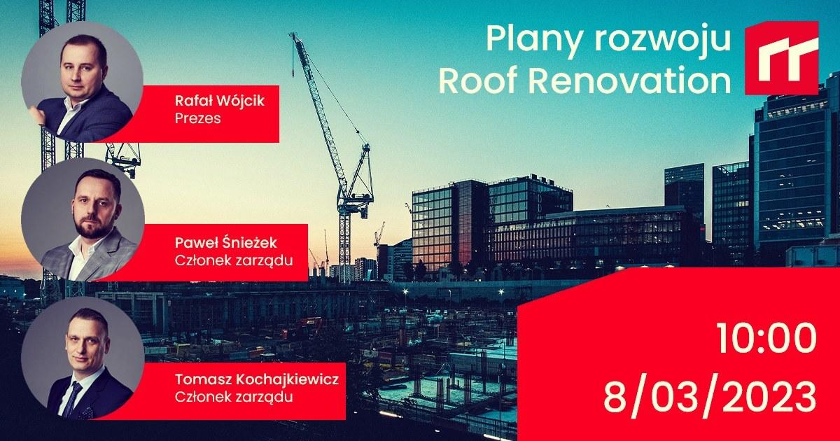 O aktualnej sytuacji spółki oraz perspektywach rozwoju będzie można porozmawiać z zarządem: prezesem Roof Renovation, Rafałem Wójcikiem oraz członkami zarządu, Tomaszem Kochajkiewiczem i Pawłem Śnieżkiem. Spotkanie odbędzie się w środę, 8 marca 2023 r. o godz. 10:00. Zapraszamy do zadawania pytań już teraz.