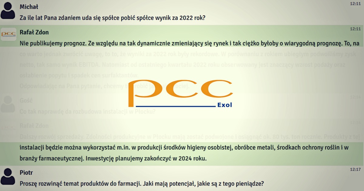 We wtorek 4 kwietnia 2023 r. odbył się czat inwestorski z wiceprezesem zarządu PCC Exol, Rafałem Zdonem. Podczas spotkania rozmawialiśmy o wynikach finansowych spółki za 2022 rok. Inwestorzy zadawali również pytania o politykę dywidendową oraz sytuację na rynku surowców.