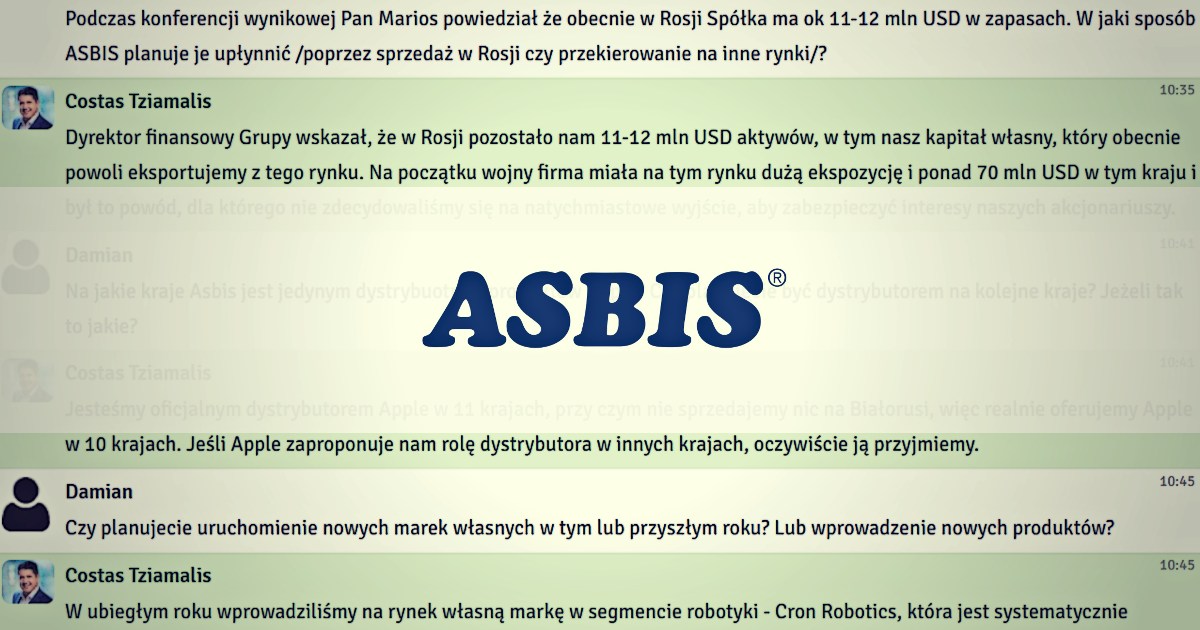 W poniedziałek 15 maja 2023 r. odbył się czat inwestorski z Wiceprezesem Grupy ASBIS, Costasem Tziamalisem. Podczas spotkania rozmawialiśmy o sytuacji finansowej spółki. Inwestorzy zadawali również pytania o dalszy rozwój na zagranicznych rynkach, nowe inwestycje oraz politykę dywidendową.