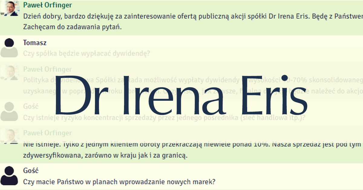 "Polityka dywidendowa Spółki zakłada możliwość wypłaty dywidendy w wysokości 40-70% skonsolidowanego zysku netto" – relacja z czatu z prezesem zarządu dr Irena Eris S.A.