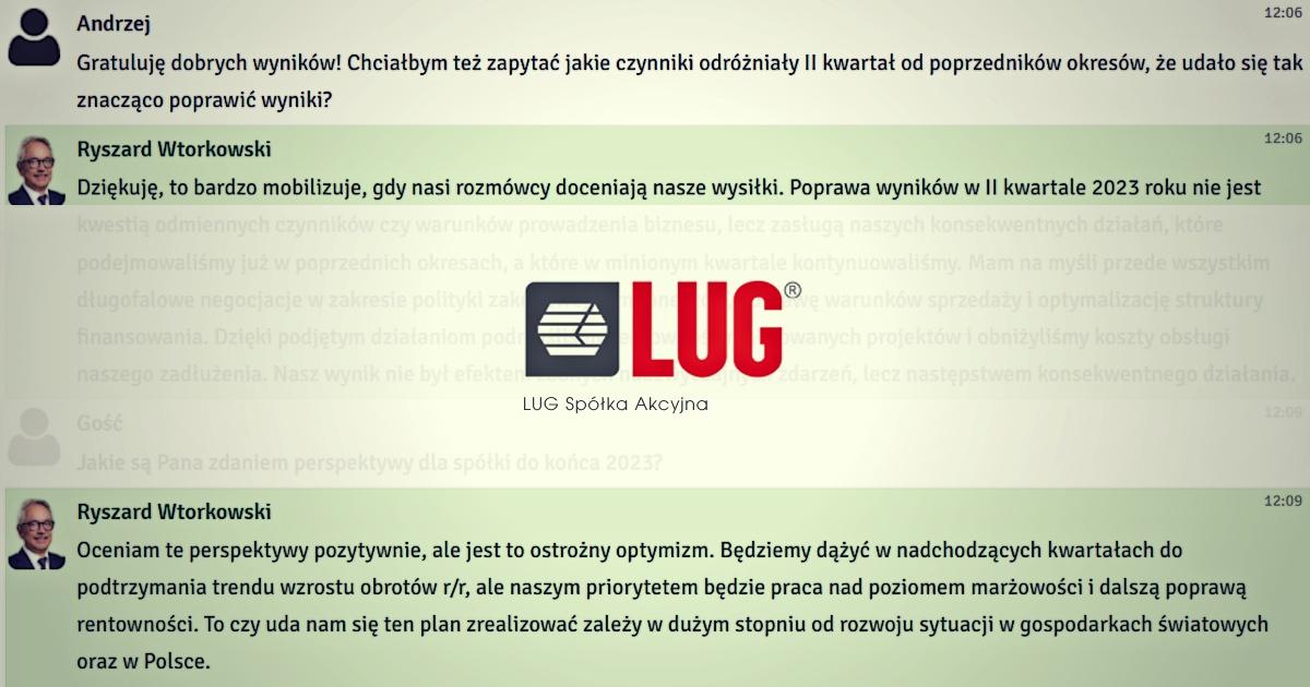 W piątek 11 sierpnia 2023 r. odbył się czat inwestorski z prezesem Grupy LUG, Ryszardem Wtorkowskim. Podczas spotkania rozmawialiśmy o wynikach finansowych spółki za II kwartał 2023 roku. Inwestorzy zadawali również pytania o wypłatę dywidendy i perspektywy na kolejne miesiące.
