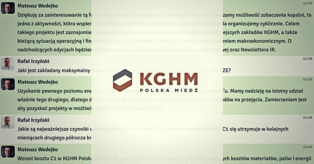 W poniedziałek, 21 sierpnia 2023 r. odbył się czat inwestorski z wiceprezesem zarządu KGHM ds. finansowych, Mateuszem Wodejko. Podczas spotkania rozmawialiśmy o wynikach finansowych za I półrocze 2023 roku. Inwestorzy zadawali również pytania o politykę dywidendową, tegoroczne inwestycje oraz budowę elektrowni SMR.