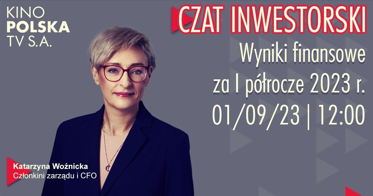 O wynikach finansowych za I półrocze 2023 roku oraz aktualnej sytuacji Grupy Kino Polska będzie można porozmawiać z członkinią zarządu oraz CFO spółki, Katarzyną Woźnicką. Spotkanie odbędzie się w piątek, 1 września 2023 r. o godz. 12:00.