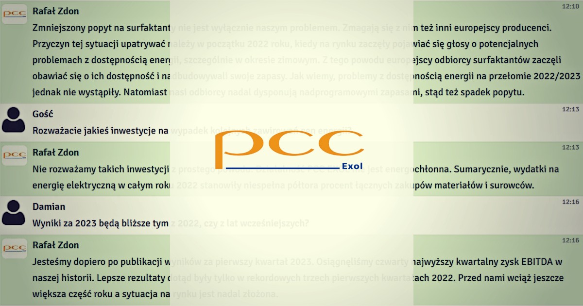 W czwartek 31 sierpnia 2023 r. odbył się czat inwestorski z wiceprezesem zarządu PCC Exol, Rafałem Zdonem. Podczas spotkania rozmawialiśmy o wynikach finansowych spółki za I półrolcze 2023 roku. Inwestorzy zadawali również pytania o emisję obligacji, inwestycje w Płocku i Brzegu Dolnym oraz aktualną sytuację na rynku.
