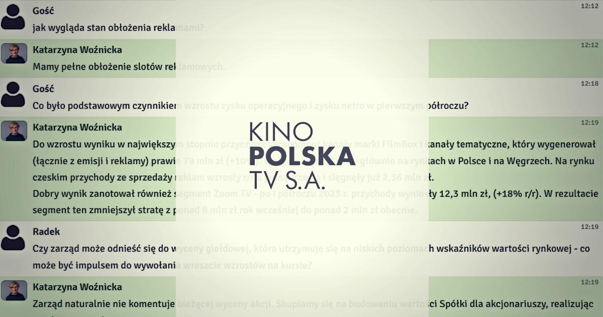 W piątek 1 września 2023 r. odbył się czat inwestorski z członkinią zarządu i CFO Grupy Kino Polska, Katarzyną Woźnicką. Rozmawialiśmy o wynikach finansowych spółki za I półrocze 2023 roku. Inwestorzy zadawali również pytania o politykę dywidendową oraz dalsze plany rozwoju.
